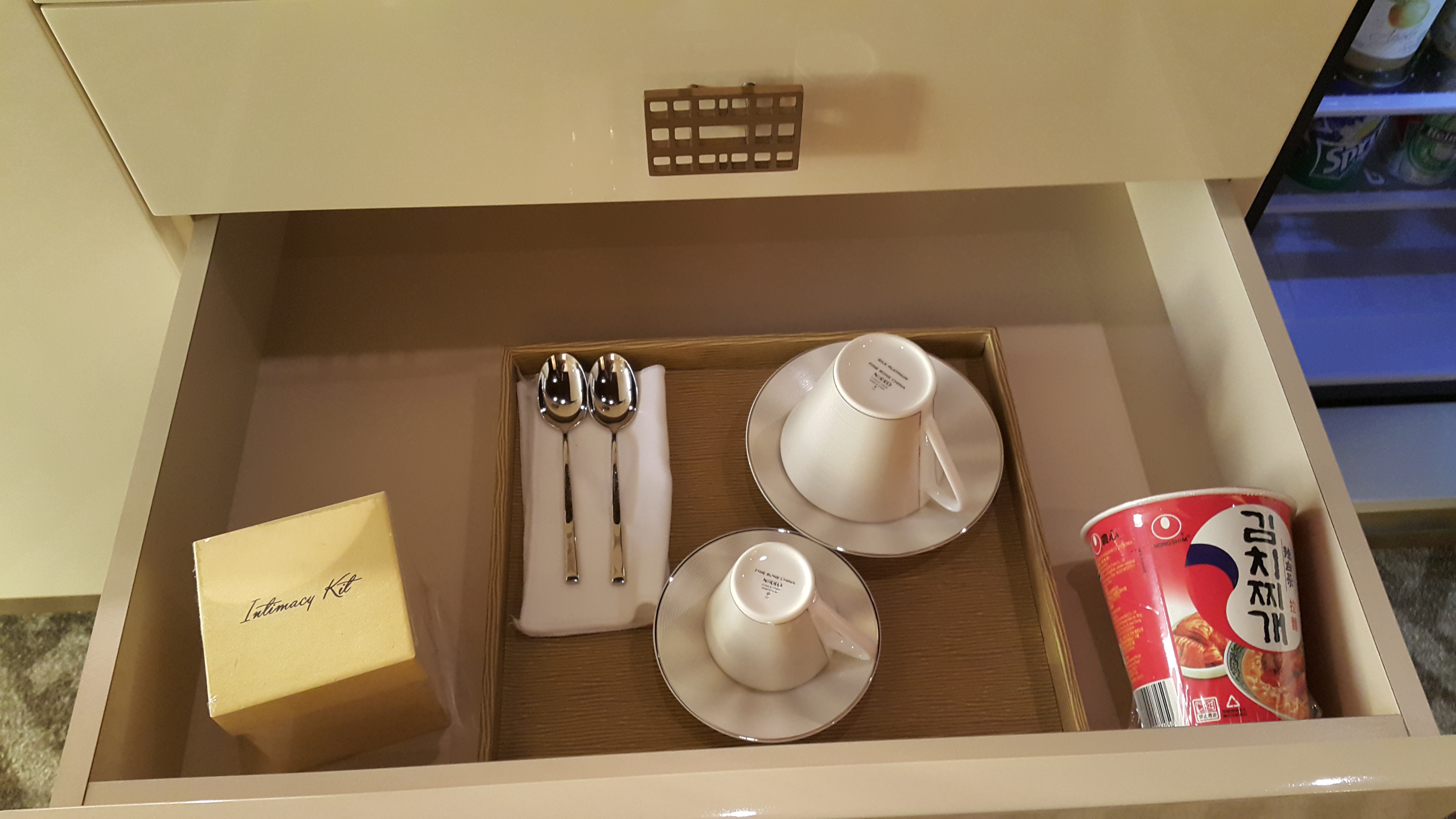 The fridge is conveniently hidden inside the wooden cabinet. There are refreshments, chocolates and liquor. For convenience, a price list is placed near the fridge as well.