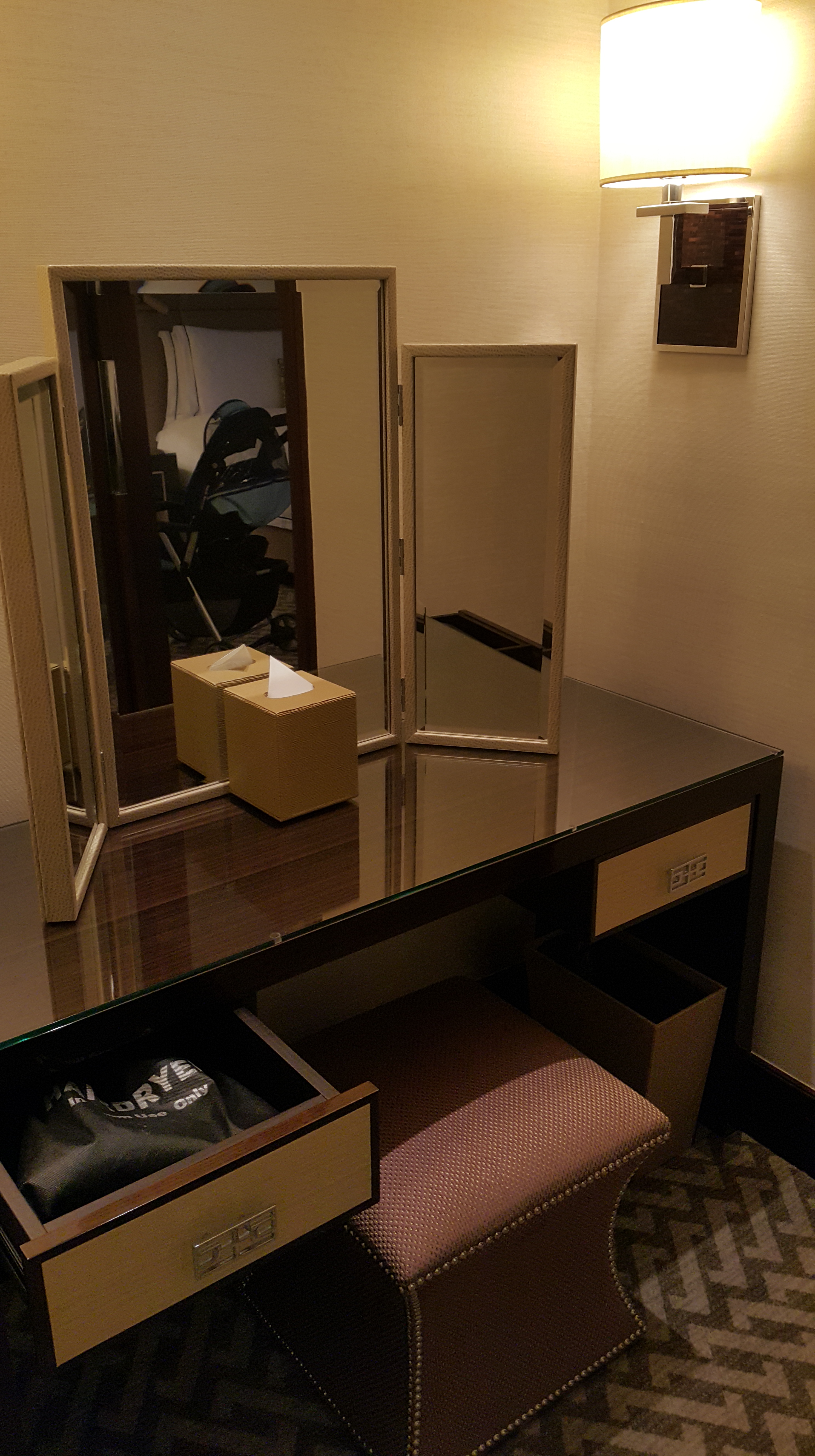 In the bedroom is a huge TV, menu for their in-room dining, a book about City of Dreams and Crown Towers (in Chinese and English language) plus a comfy desk chair.