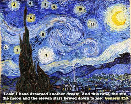 In Genesis 37:9, Joseph in a sense tells his brothers/detractors about his dream to let them know that he believed that one day the tables would turn. Van Gogh also might have intended Starry Night to work as a personal statement concerning his own poor critical reception as an artist. Although we cannot know what Van Gogh originally intended, it may be that the artist referenced Genesis 37:9 in hopes that he too would receive recognition and respect for his work later on, just as Joseph did in the Bible after a difficult early life. Although he died before he could see it for himself, Van Gogh would probably be very pleased with the widespread fame and recognition his art enjoys today. – Legomenon.com