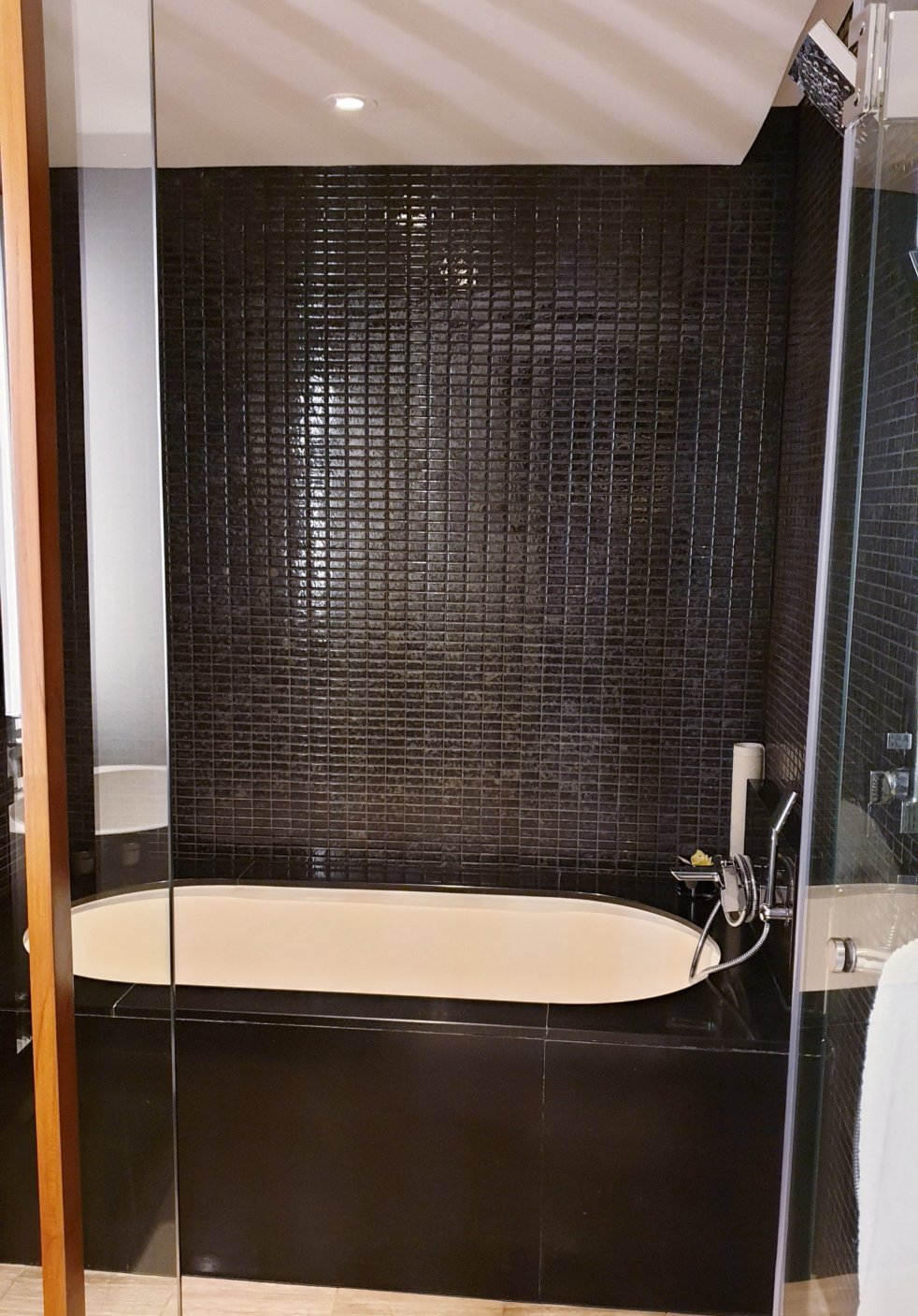 I’m not sure if you noticed the big space you still have — from the tub area going to the washing area.. to the toilet area. Restroom is really spacious plus the toilet bowl is very techy and helpful.